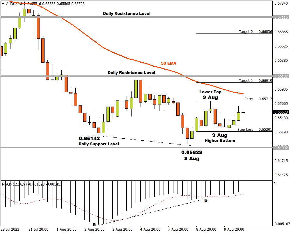 On 8 August the bears tried to break through the daily support level but could not manage and the bulls took over. They tried to reach the daily resistance level and after another bearish attempt to take control, a higher bottom formed on 9 August at 0.65201.