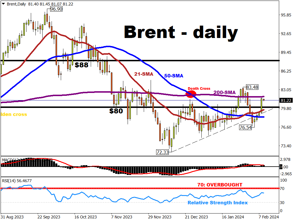 If Brent breaks above its 200-day SMA, then oil bulls will be tempted into revisiting that January 29th peak of $83,48,
