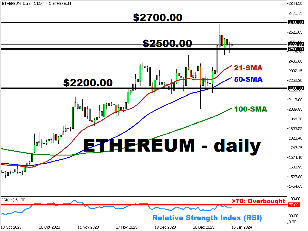 ETHUSD bulls are trying to stabilize above the $2500 support level following last week’s spike above $2700 as the markets celebrated the first-ever spot bitcoin ETF launch.