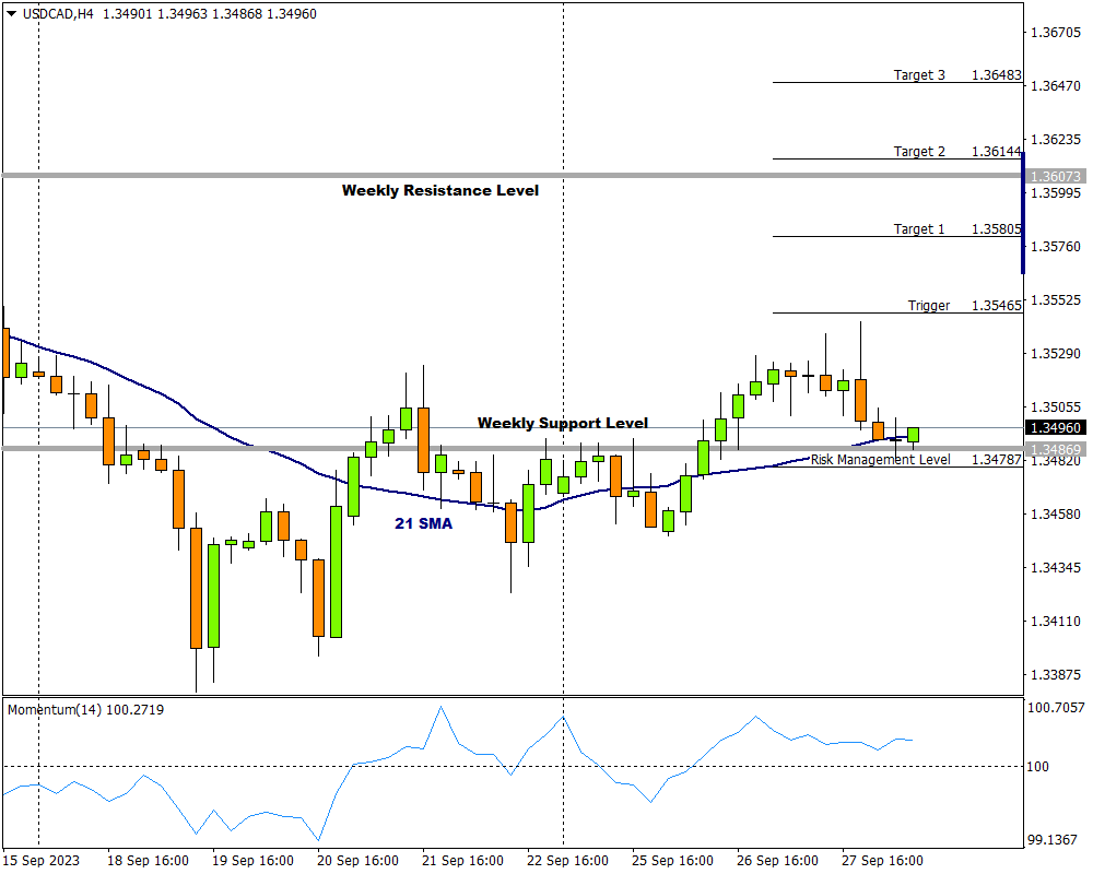 For a more detailed look at a possible long opportunity, the H4 time frame is helpful. The price is currently at the weekly support level having broken through and is bouncing off the 21 Simple Moving Average (SMA). The Momentum oscillator provides more confluence to the possible bullish momentum by being above the 100-base line.