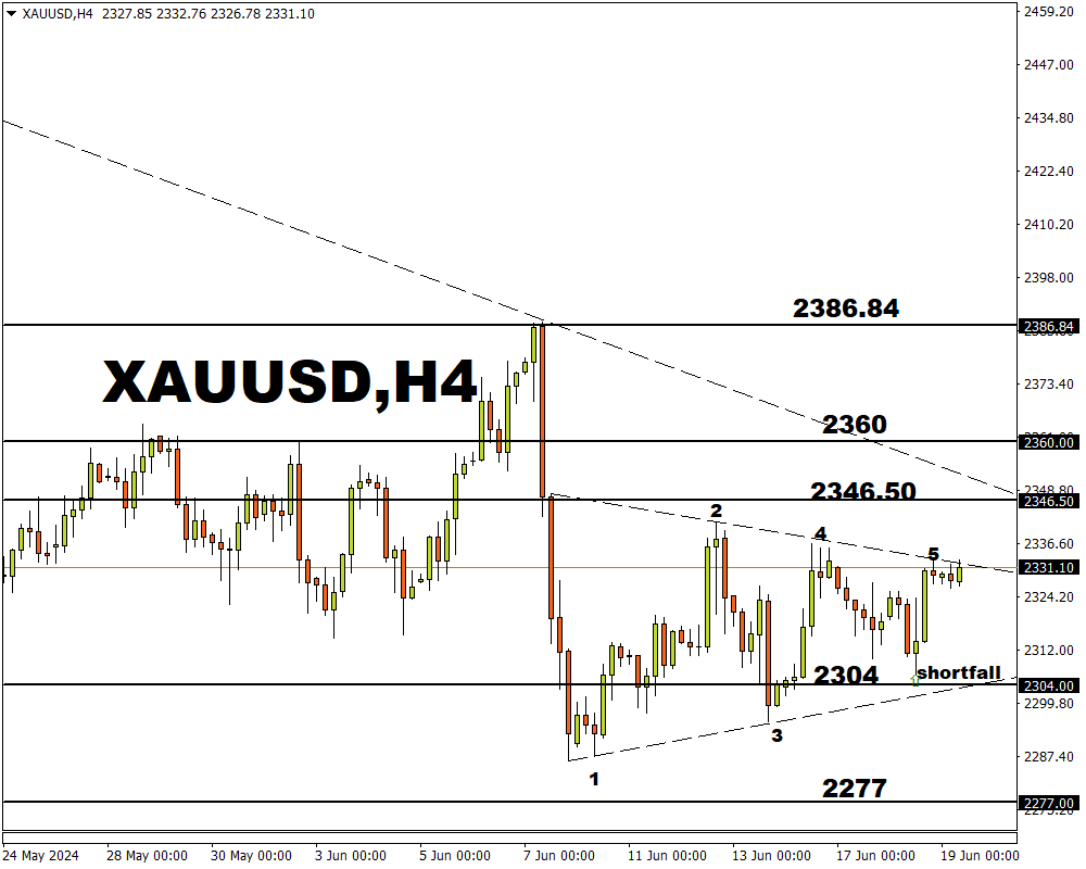 On a breakout of the triangle, gold bulls may have to overcome the trend line resistance (drawn from May 20th high at $2450.03 and tested on June 7th, 2024).